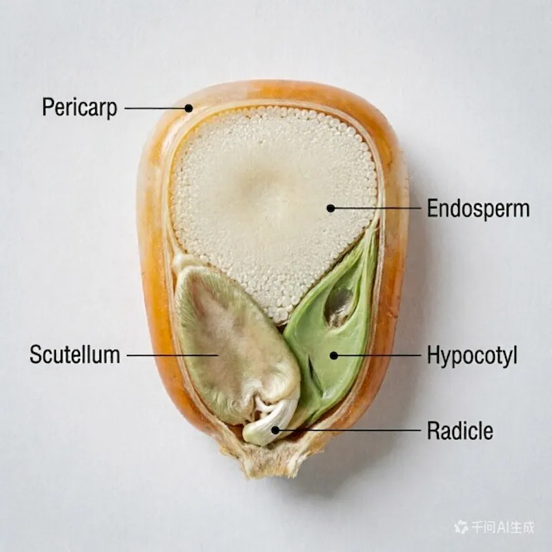 Root cap situates at the bottom and only forms 0.8%~1.1% of the grain dry weight. It should be removed during processing.
